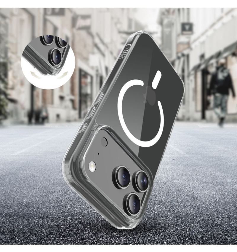 Klasyczny, jednoczęściowy case Flexair Hybrid Magsafe od Tech-Protect o przezroczystym wykończeniu, stworzony z myślą o podkreśleniu linii i oryginalnej sylwetki urządzenia.
