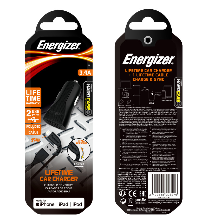 Ładowarka samochodowa Energizer HardCase posiada dwa porty USB-A o łącznej mocy 17W, co pozwala na jednoczesne uzupełnianie energii w dwóch urządzeniach. Ładowarka posiada zabezpieczenie przed przegrzaniem, przeładowaniem i nadmiernym prądem, chroniąc tym samym zarówno ładowarkę, jak i podłączone urządzenie.