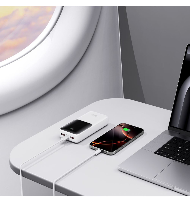 Power bank wyposażony jest w dwa porty USB-A, jeden port USB-C oraz port Micro-USB, co zapewnia maksymalną kompatybilność z różnymi urządzeniami. Elegancki i nowoczesny design z wyświetlaczem LED pozwala łatwo monitorować poziom naładowania baterii, a solidna, kompaktowa konstrukcja gwarantuje trwałość i wygodę użytkowania. Dodatkowo zaawansowane systemy zabezpieczeń chronią przed przegrzaniem, przeładowaniem i zwarciem, co zapewnia bezpieczeństwo podczas codziennego korzystania.