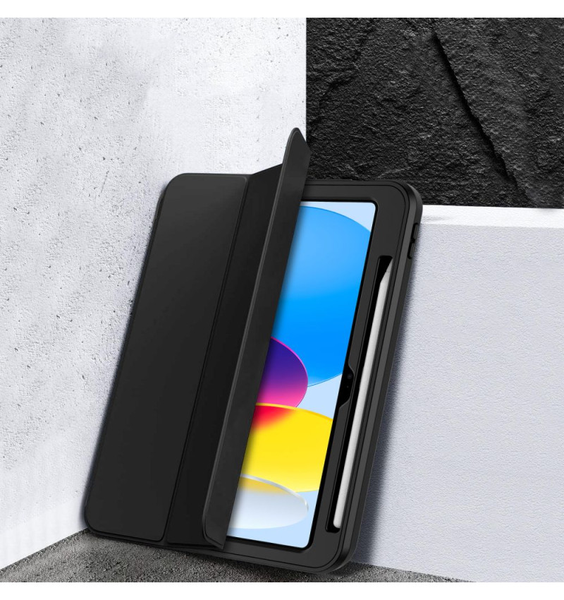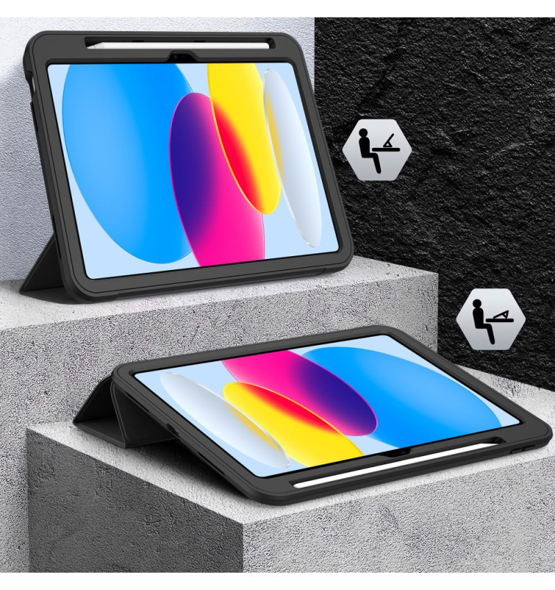 Dodatkowo posiada uchwyt na Apple Pencil i rozkładaną podstawkę, dzięki której można wygodnie ustawić tablet pod różnymi kątami – idealnie do pracy, oglądania filmów czy przeglądania internetu. Precyzyjne wycięcia pozwalają na swobodne korzystanie ze wszystkich funkcji iPada bez konieczności zdejmowania etui.